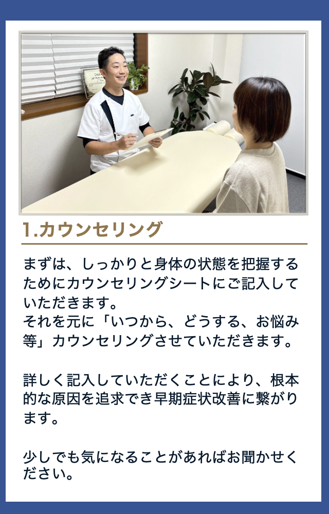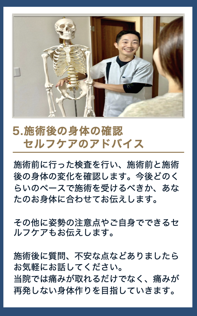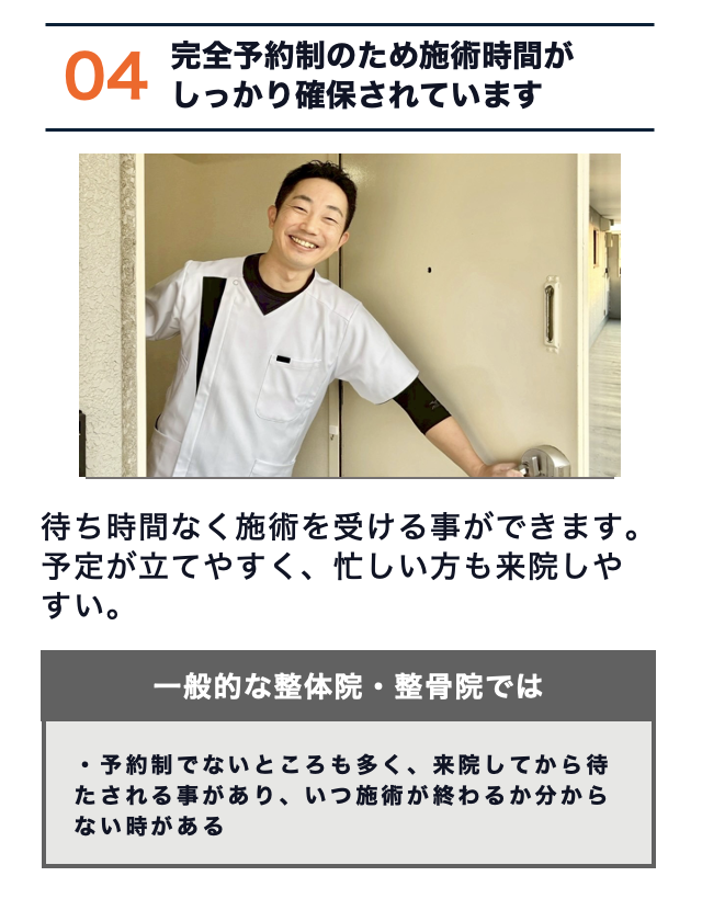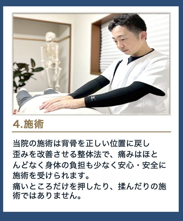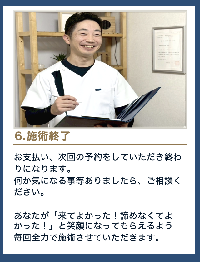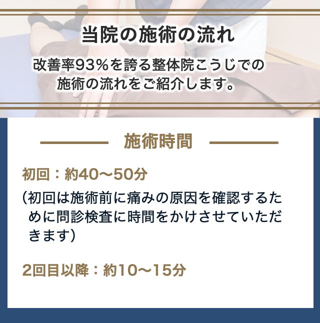 「こんなのでよくなるの?」と思う方もいるかもしれませんが、長時間の施術を行うのは逆に負担をかけ過ぎてしまうパターンもあります。特に重症者の場合は長時間の施術は負担になります。