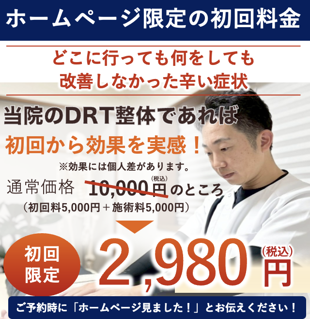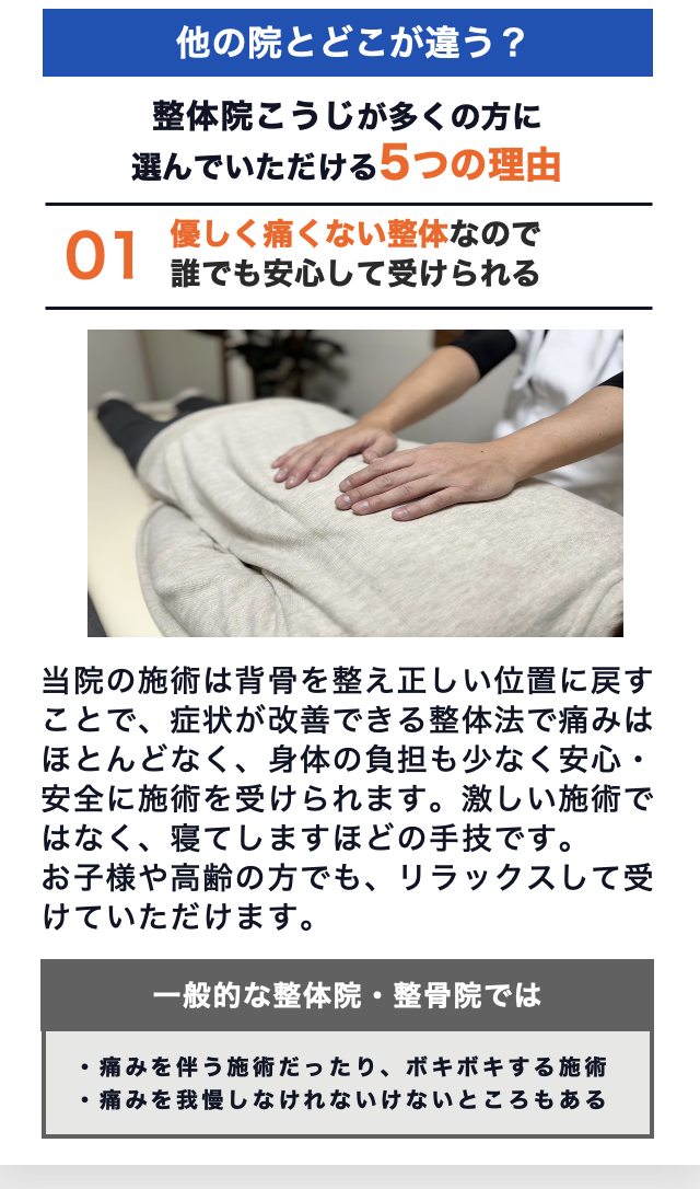| なぜ、初回2,980円なのか? それはもうあなたに同じ過ちを繰り返して欲しくないからです。改善されないその場しのぎの施術に、あなたの大切な時間とお金を費やして欲しくないんです。 その場だけ楽になる効果の持続しない施術をいつまで続けますか? 不安を解消でき安心できる施術を受けて明るい未来を手にしませんか?」 地域で圧倒的な改善実績を誇る「重症症状専門」の 整体院こうじで安心を手に入れて下さい! |